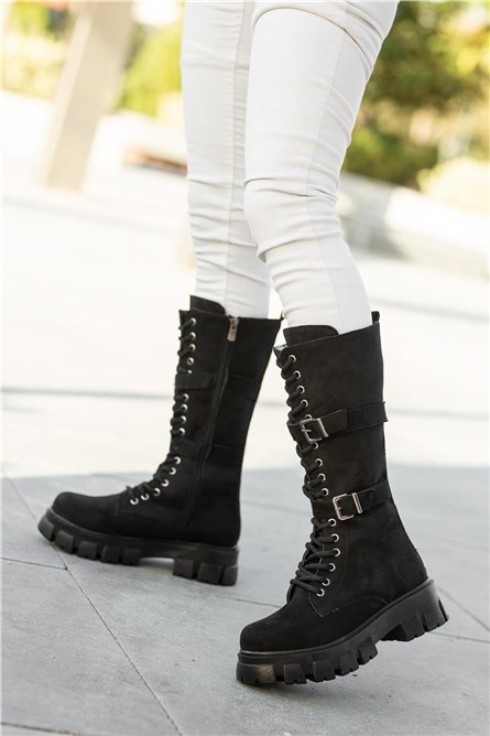 Women's Suede Lace Up Side Buckle Boots - Black #362376
